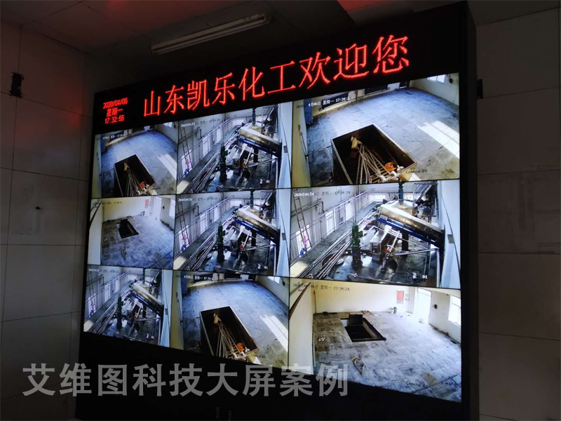 本次高清液晶大屏幕拼接屏監(jiān)控系統(tǒng)建設(shè),共包含9臺(tái)49寸LG拼接屏、1臺(tái)??低暯獯a矩陣、9單元落地機(jī)柜電視墻、1套3人位操作臺(tái)、1套P3.75單色LED顯示屏,9套高清信號(hào)線材等從,分別用在山東省棗莊市凱樂(lè)化工有限公司高清視頻監(jiān)控室。