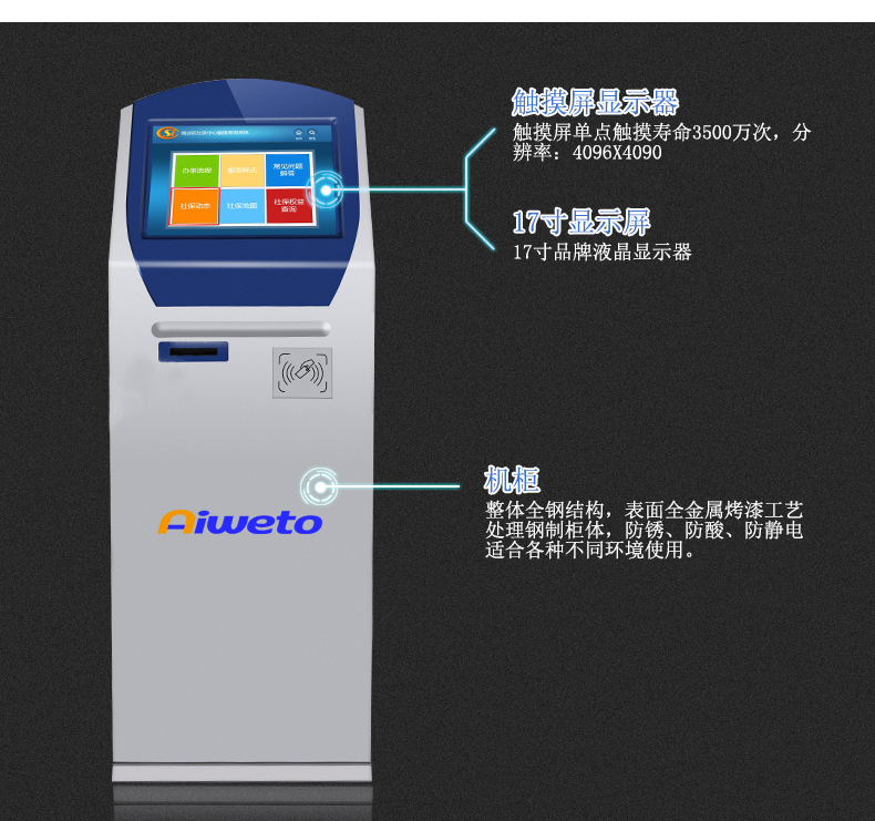17”19”排隊(duì)叫號(hào)機(jī),排隊(duì)取號(hào)系統(tǒng)軟硬件皆可定制,多種組件可選擇:附帶功能可調(diào)換,可智能讀取二代身份證支持紅外掃描,條形碼、LED顯示屏,鍵盤,更換色板等高端配置,極速體驗(yàn)。