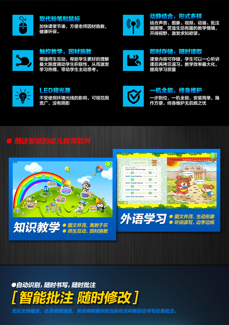 AW系列-多媒體教學一體機,高清大屏顯示,壁掛支架多種使用方式,人性化機型設計,立式與掛式兩種使用方法可交替使用,避免使用環(huán)境發(fā)生變化時產(chǎn)生的資源浪費問題采用LED背光源長壽命,低功耗,環(huán)保節(jié)能。智能電子白板,各種文件一鍵加載,多點觸控智能電子白板適用于各種商務會議,支持手寫批注,兼容日常office辦公軟件,本地、U盤、網(wǎng)盤、局域網(wǎng)數(shù)據(jù)輕松駕馭。書寫流暢,減少視覺誤差,高端企業(yè)必備,多重主題背景,筆形色彩,任意選擇。高端配置 讓運行速度,完美兼容WIN7,WIN8 隨意切換。
