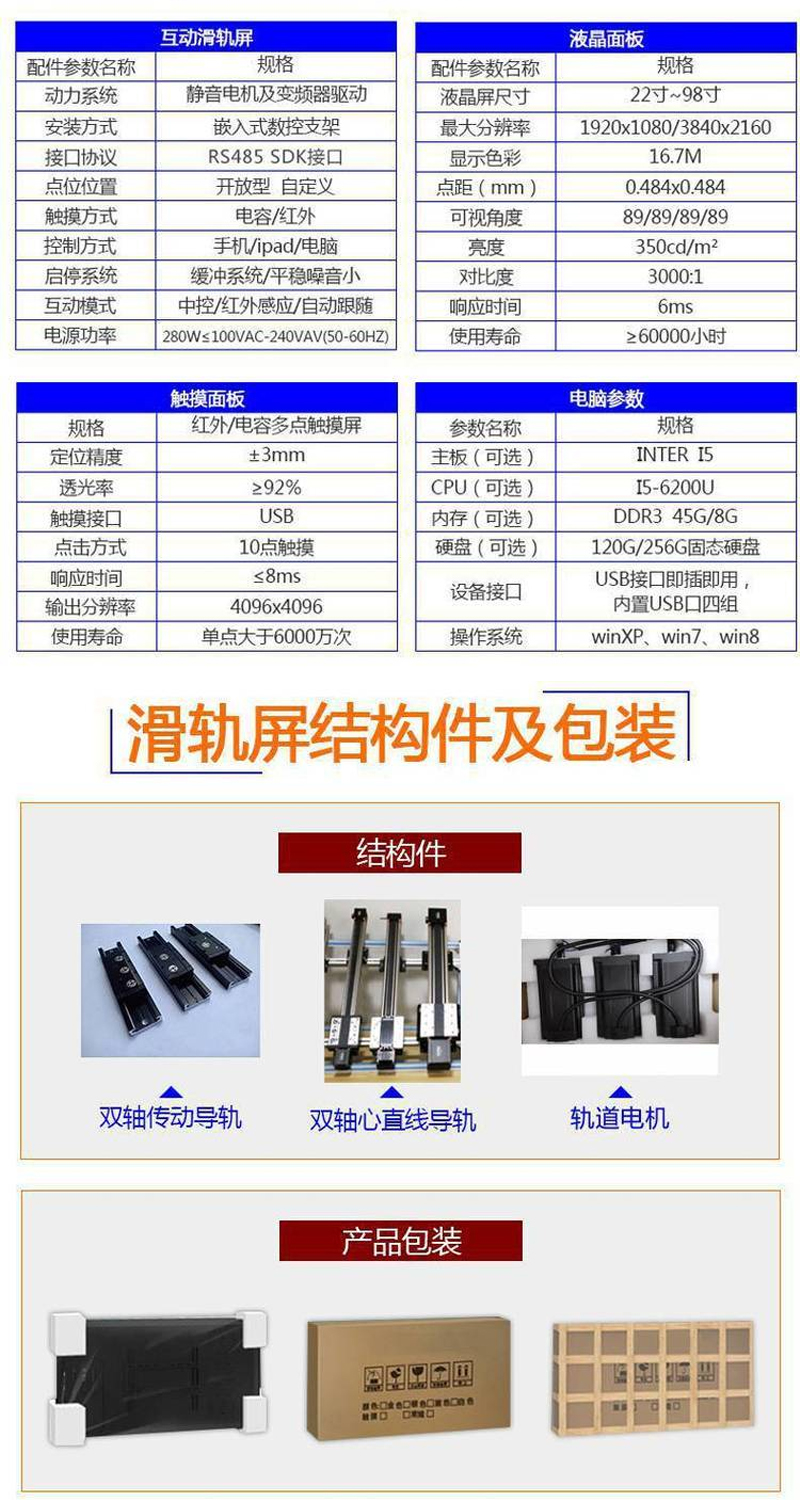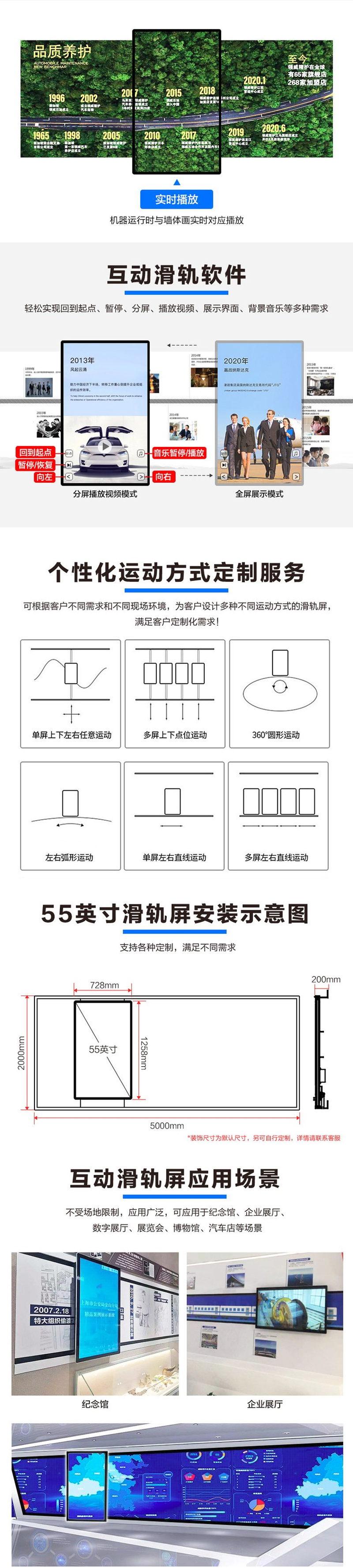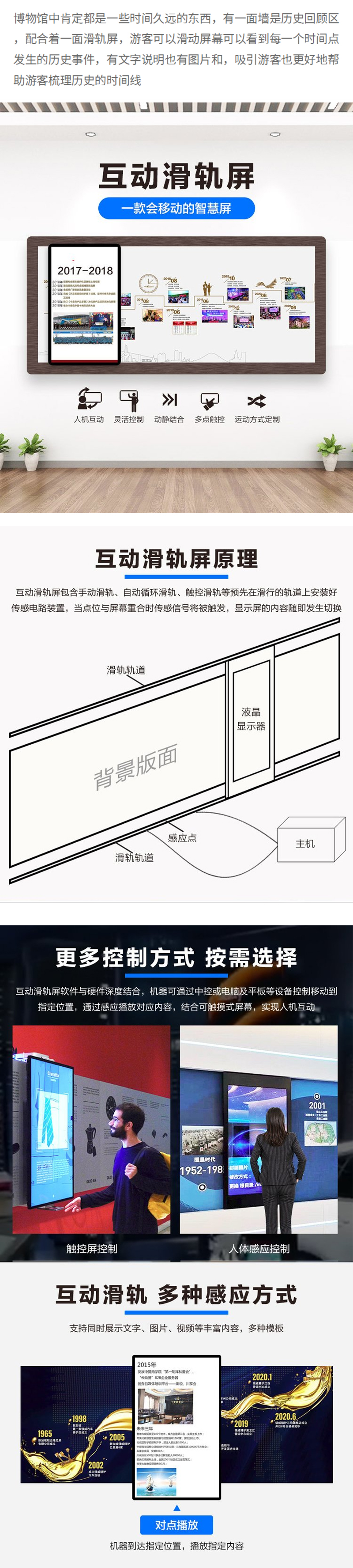 常規(guī)的觸摸互動和體感互動屢見不鮮,滑軌系統(tǒng)升級互動模式,新增電動機械互動形式,體現(xiàn)智能科技制造,是一種全新的互動體驗?zāi)J?。電動滑軌,是滑軌互動系統(tǒng)的全新升級,又稱為滑軌電視,簡言之是可以在軌道上滑行的顯示屏。通過機械滑軌控制裝置,結(jié)合高清液晶顯示幕墻,實現(xiàn)對屏幕內(nèi)容的互動控制:在展墻上安裝廣告板或者液晶屏作為背景幕墻,通過一組可滑動的機械軌道以懸掛液晶顯示屏,可在背景墻上設(shè)置多個感應(yīng)點,當液晶顯示屏移動到每個感應(yīng)點時即可自動播放對應(yīng)內(nèi)容,內(nèi)容可支持圖片,文字,視頻等多種形式,可與觸摸同時使用,讓展示更具有科技感,智能化。